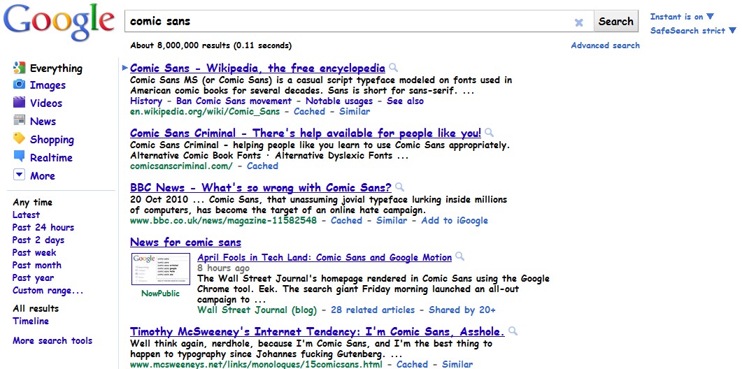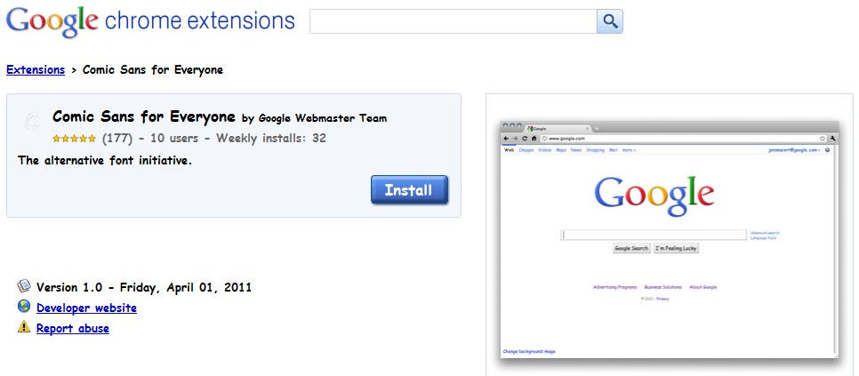 针对Chrome, Google 特别推出了 Comics Sans for Everyone 这个 Chrome 扩展,安装后 Chrome 打开所有的网站都会以 Comic Sans 字体显示。