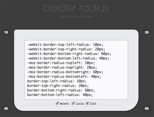 现在给大家介绍 Border Radius 是一款在线应用,可以很方便的生成 CSS3 圆角代码,即时显示效果,并提供 webkit ,Gecko 兼容代码。很方便使用